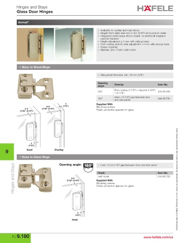 → Glass to Glass Hinge Opening angle: > Inset: 3 mm (1/8") gap between door and side panel