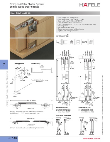 Minimum door width with one soft closing mechanism. B = internal cabinet height B = internal cabinet height