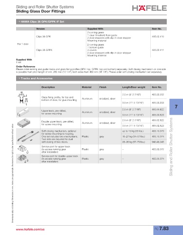 Please order running and guide tracks and glass fixing profiles (GPK: top, GPPK: top and bottom) separately. Soft closing mechanism on one side