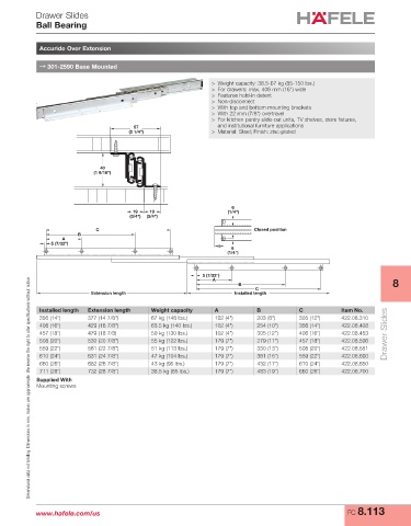 457 (18") 479 (18 7/8) 59 kg (130 lbs.) 102 (4") 305 (12") 406 (16") 422.08.453 Drawer Slides